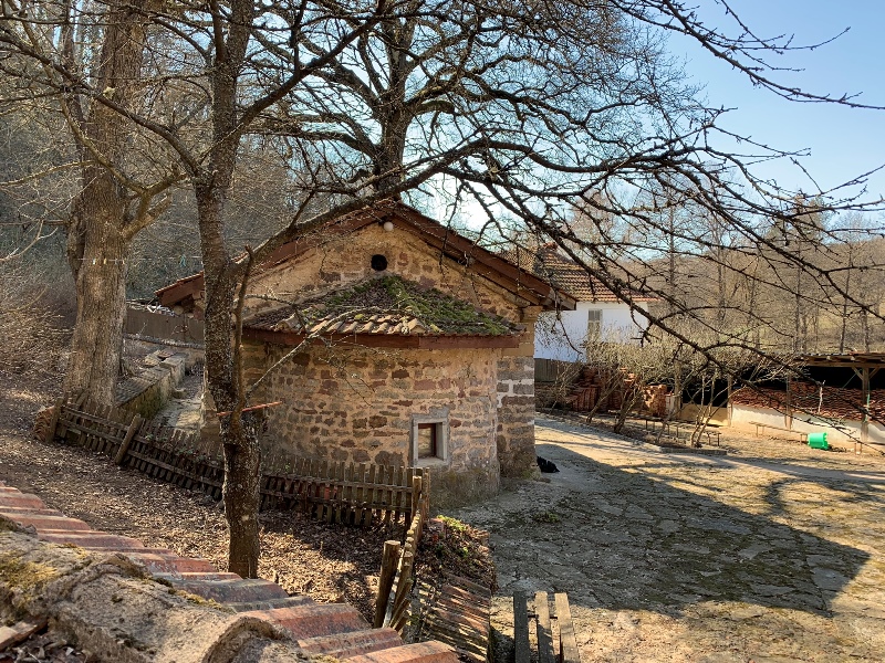 Почти до манастира чуваме силен лай и виждаме средноголямо куче, което тича към нас. За момент се сепваме, тъй като не виждаме да има хора и не знаем дали кучето е агресивно. В момента, в който стига до нас обаче, то изпада в бурна радост и започва да скача. Още един домакин ни посреща пред манастира – магаре, което лежи, и когато ни забелязва, се изправя и също идва при нас.