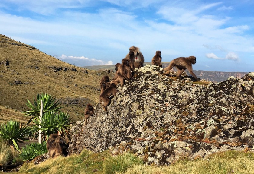 Тръгваме по пътеките наоколо. Етиопски вълк пресича пътя ни и докато извадя телефон, за да го снимам, вече е някъде из гората. Но маймуни гелада отново има навсякъде около нас. На един хълм попадаме на бой между няколко маймуни. Отначало не разбираме какво точно се случва, само чуваме крясъци. След малко обаче няколко маймуни приближават, гонени от други, и точно на метри от нас, се сбиват жестоко и цялата сцена изглежда страховито. Бавно се отдалечаваме, макар че те не ни обръщат никакво внимание.