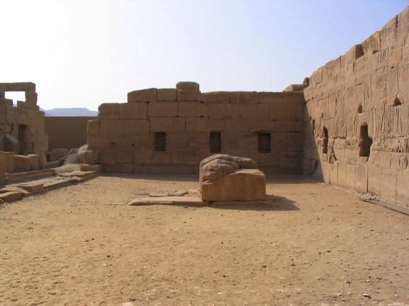 Централната част на храма се състои от светилища, посветени на тиванската триада Амон, Мут и Хонсу. От петте светилища, достъпни през вестибюла, трите централни са посветени на ладиите на тиванската триада – в средата за ладията на Амон, вдясно – за Хонсу и в ляво (на юг) за богинята Мут. Централното помещение, посветено на Амон, е много по-голямо от останалите четири. Най-свещената част на храма се поддържа от четири квадратни колони и е посветена на четири прояви на Амон: Амон-Ре, Амон-Камутеф, Амон-Ра-Хорахте и Амон-Атум-Озирис. Всеки един от тях се чества в едно от четирите светилища на север и юг от това помещение.