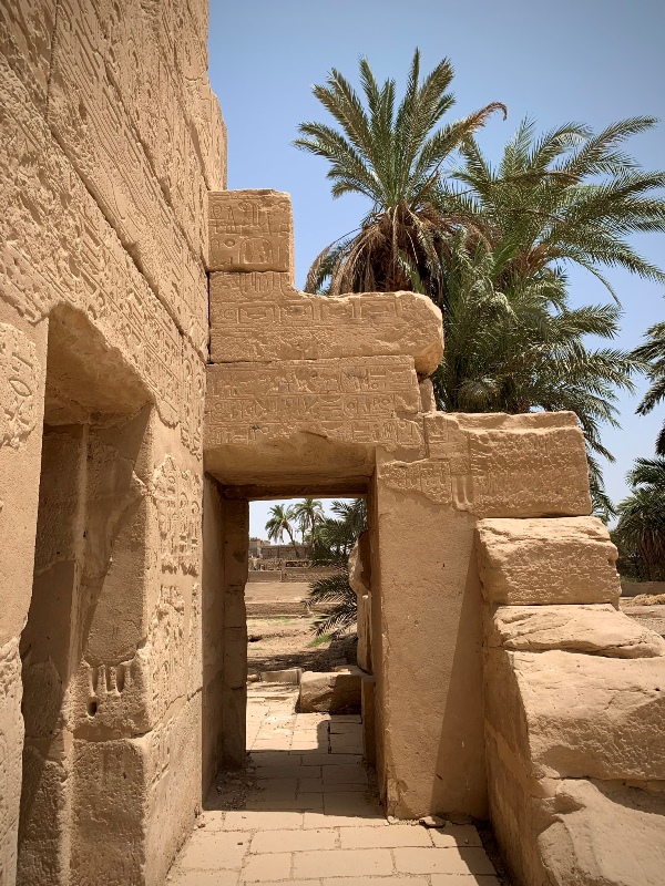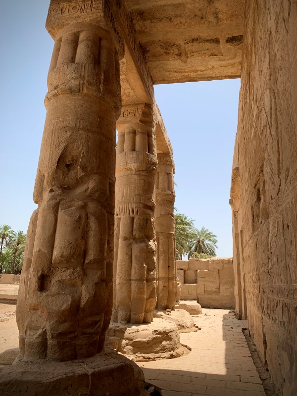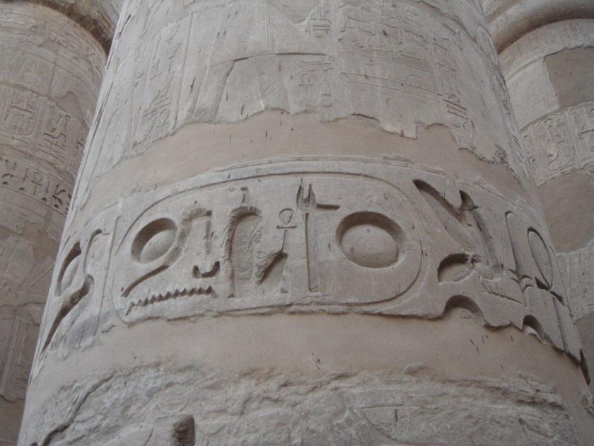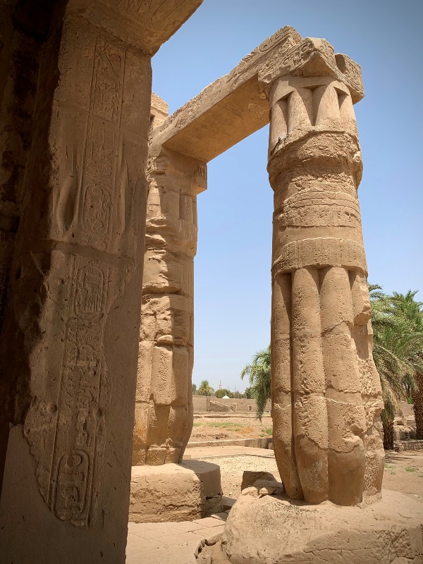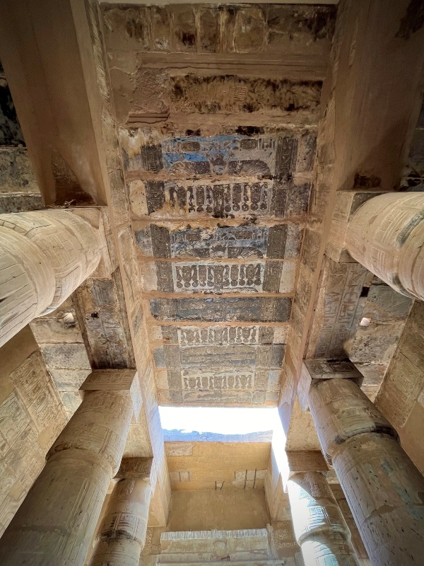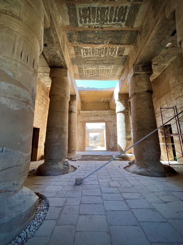 Влиза се в първата хипостилна зала, която е широка около 52 метра и е дълга 11 метра. Покривът, част от който е паднал, се поддържа от 24 колони във вид на събрани папируси, с капители във вид на цвета на растението.