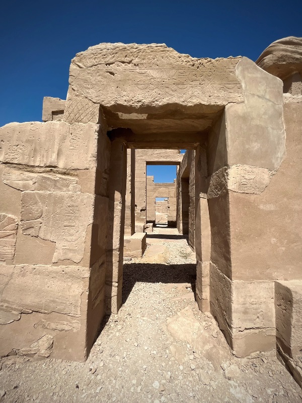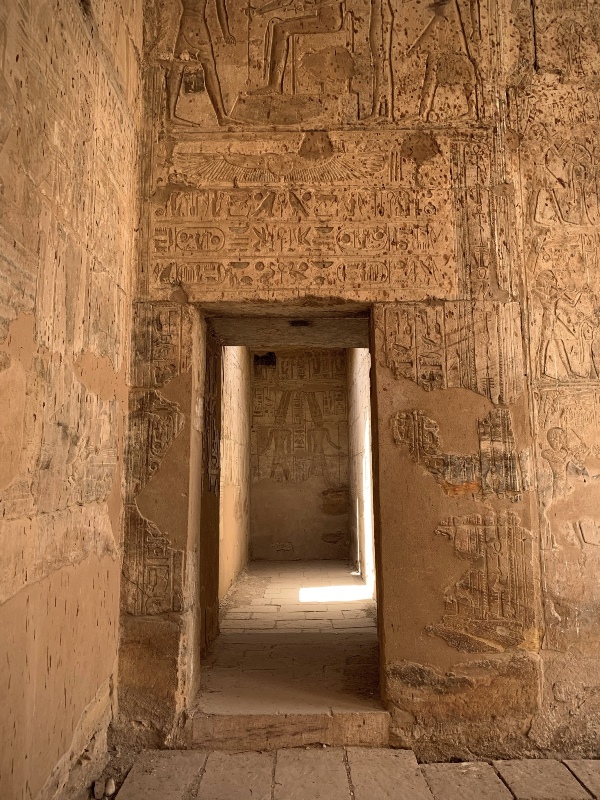 Седемте врати, поставени по оста на изградените входове и светилища, водят от първата хипостилна зала към втората хипостилна зала, в която декорацията е в характерния за Сети I фин и изящен изпъкнал релеф. Надписите и изображенията върху стените и колоните са от времето на царуването на Сети I и са с великолепна изработка. Профилът на царя навсякъде е изобразен с изключително майсторство.