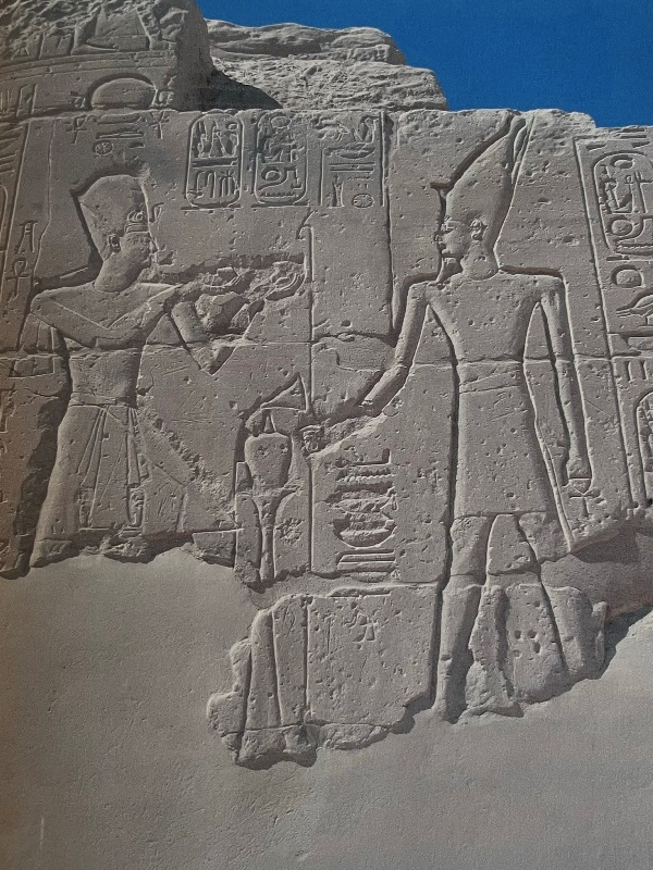 Релефите, изобразяващи Сети I със сина му Рамзес II, са разположени в хипостилната зала, свързващия напречен коридор, вестибюла на покоите на Рамзес I и задната част на портика. Те са от различни етапи от релефната работа на Рамзес II, като най-ранните от тях са разположени в хипостилната зала, напречния коридор и частите от вестибюла.
